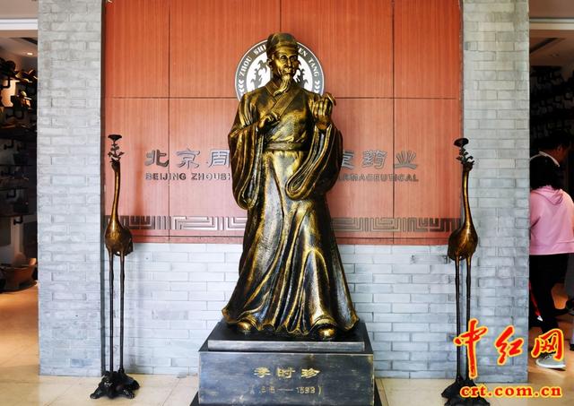 摆放在北京周氏时珍堂药业有限公司办公大楼一层大厅的李时珍塑像。(中红网金梅摄)