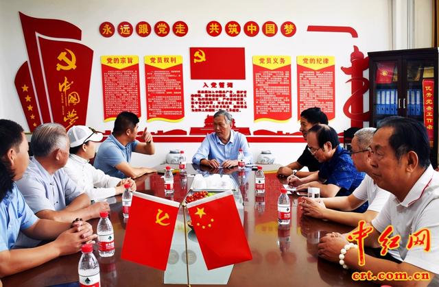 北京周氏时珍堂药业有限公司董事长周海利(左四)向来访的中红网江山(左五)等介绍公司的发展情况。(中红网金梅摄)