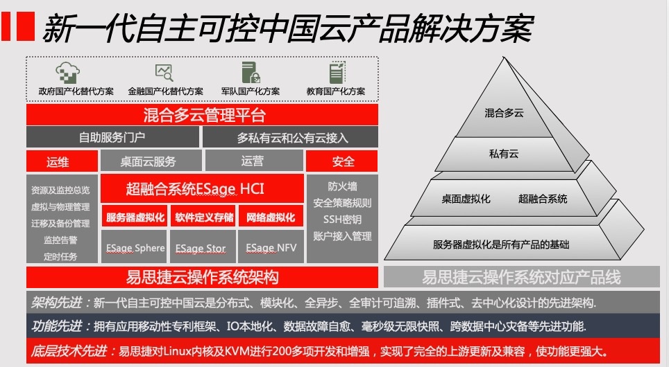 倪光南说:核心技术若不能自主可控,随时会被卡脖子。易思捷新一代自主可控中国云,从内核到UI的代码都是自主编写和维护,拥有完整的自主知识产权。特点如下: