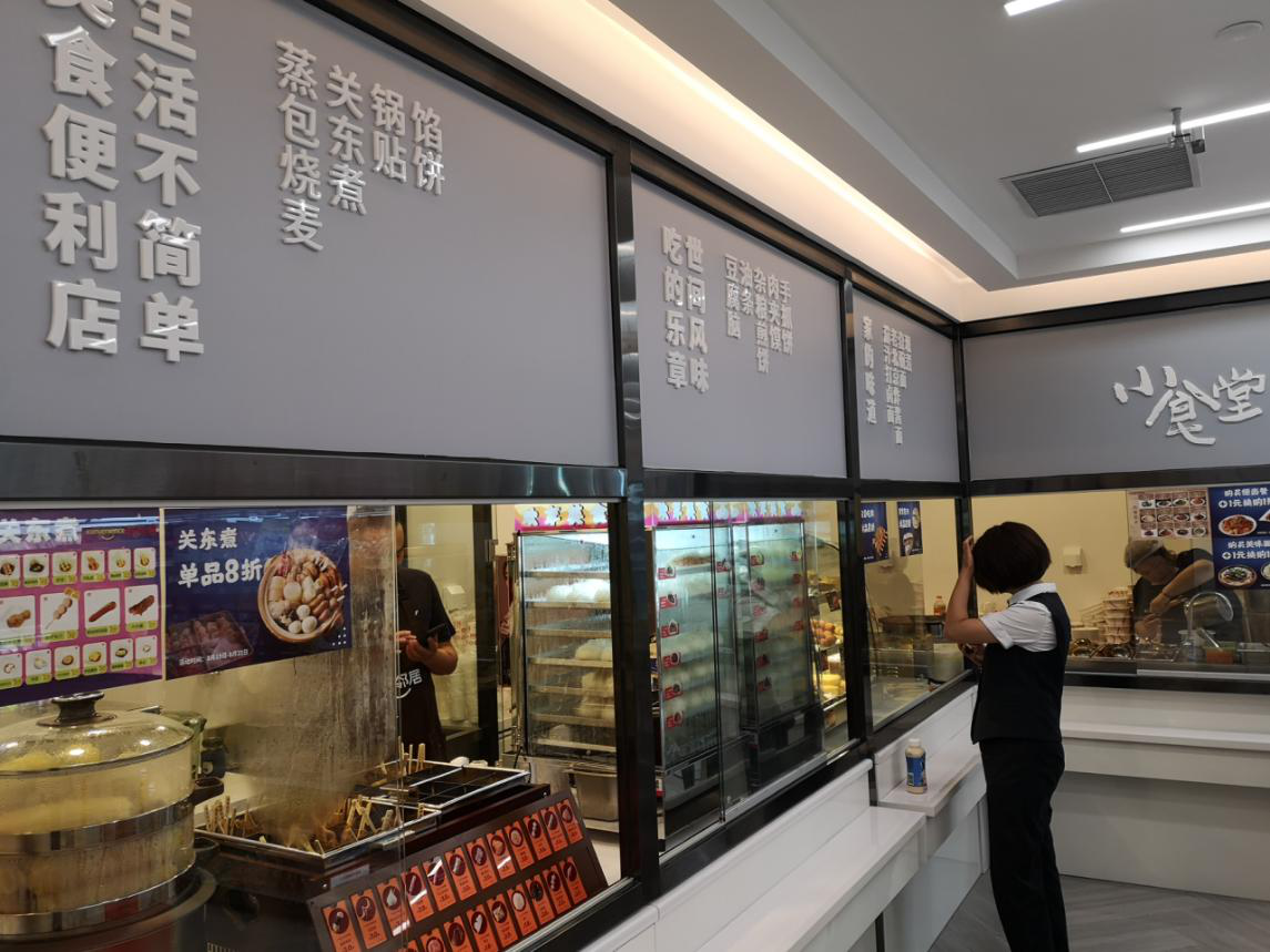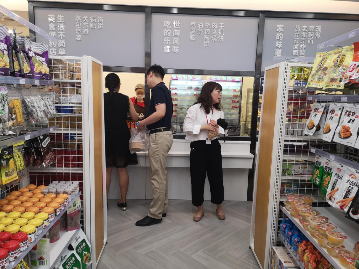 据介绍,新门店有三大亮点:1、年轻的设计感;2、便捷的结账设备和利用感应货架去抓取用户数据;3、老北京炸酱面、煎饼、盒饭等小食堂便民措施。