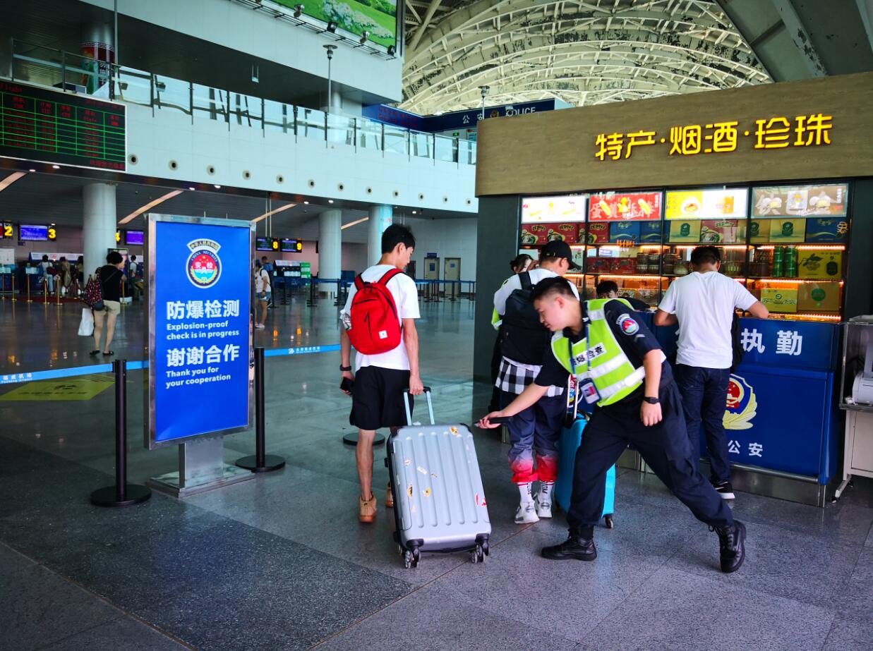 毕节职业技术学院航空学院学子龚喜正在进行防爆安检